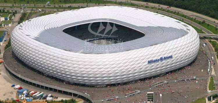 安聯(lián)球場由2874個菱形膜結(jié)構(gòu)構(gòu)成,膜結(jié)構(gòu)具有自清潔,防火、防水以及隔熱性能,每個膜結(jié)構(gòu)都可以在夜間被照成紅藍(lán)白三色,分別對應(yīng)于拜仁、1860以及德國國家隊的隊服顏色。